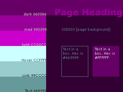 Purple Palette From mindymcadams.com What you see at left is a GIF image, which was made in Photoshop. > See the mango palette > See this site's palette For more information about colors, please go to Resources for Web Workers and click the link on the lower right: Color Tips |