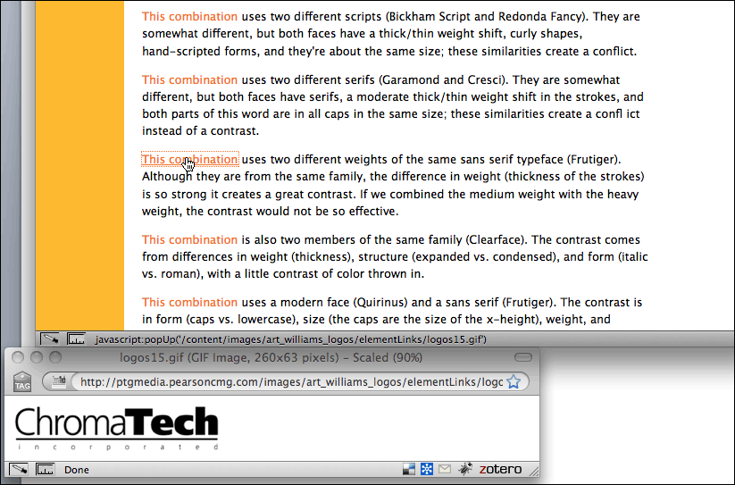 - Combine Typefaces (from "Project: Logos"; this is page 4 of 7 -- you are assigned to read ONLY page 4): Open each one of the linked examples to learn *A WHOLE LOT* about how to choose two typefaces that look great together. (Arrange the pop-up window so that each time you click a different example, it's easy to view, like this.) Note that some of the examples show a BAD combination, so READ THE TEXT for each example to see what you should learn from it. (Peachpit Press articles: Design)