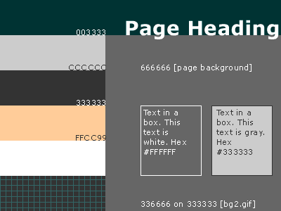 What you see at left is a GIF image, which was made in Photoshop. If you're trying out palettes, it can be very helpful to make something like this (with the hexadecimal codes for the browser-safe colors) to see how the colors will look together. It's a useful reference for you and it can help to construct a style sheet (CSS). The palette at left is the one for this syllabus site. > See the purple palette > See the mango palette For more information about colors, please go to Resources for Web Workers and click the link on the lower right: Color Tips |