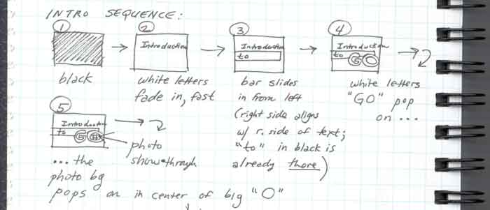 | This sketch shows the plan for the opening sequence. It shows a series of tweened sequences as single frames, and describes the motion that the users see. The background photo had already been taken and selected. < Previous | Full Pages | Next > |